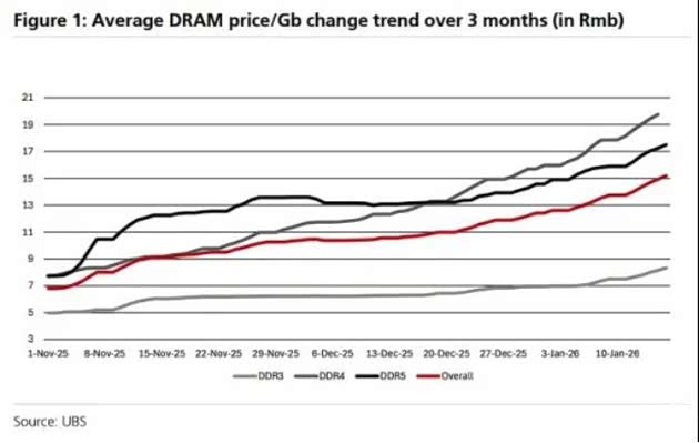 报告数据显示,汽车应用领域的DRAM价格在三个月内暴涨180%,富国银行指出,DDR5现货价格较2024年平均水平高出8倍以上,DDR4价格更是高出16倍,车规级DRAM本就因需满足耐温、抗震、高可靠性的严苛标准,价格高于消费级产品,而汽车行业在全球DRAM市场中份额不足10%,部分数据显示这一比例甚至仅为3%,薄弱的议价能力让车企难以抵御芯片涨价的压力。