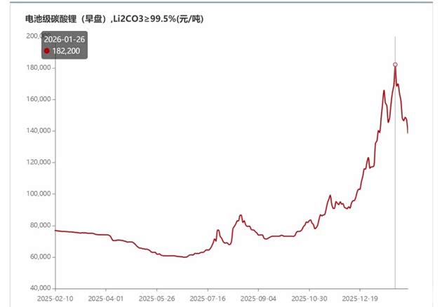 作为动力电池的核心原料,电池级碳酸锂的价格走势尤为惊人,从2025年初的每吨75,700元飙升至2026年1月26日的182,200元,涨幅超150%,尤其是2025年四季度以来涨势进一步加剧,23天内价格就实现了35%的上涨,即便后续有小幅回调,价格仍处于历史高位。