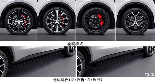 轮毂提供20英寸和21英寸两种,有五种轮毂样式,主打五辐花瓣式设计,其中还有亮黑色的运动轮毂,此外提供红色卡钳可选。值得注意的是,申报图显示轮胎都是ARISUN品牌——中策集团的高端品牌,比朝阳轮胎更高级一点。