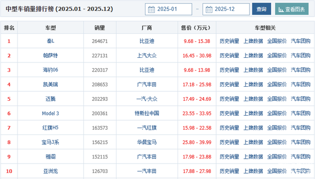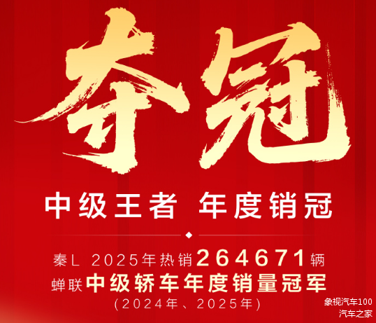 秦L同期也热销264671辆,连续两年(2024-2025)斩获中型轿车市场年度销量冠军。