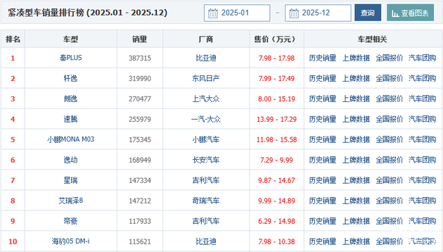 其中,秦PLUS在2025年爆卖387315辆,以极大优势力压轩逸、朗逸等合资产品,连续3年(2023-2025)荣获紧凑型轿车市场年度销量冠军。