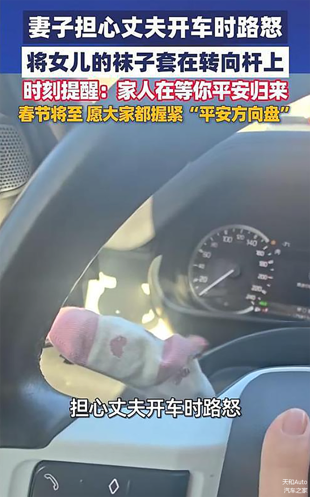 妻子害怕丈夫开车时犯“路怒症”的毛病,于是把女儿的小袜子套在转向杆上;生气就看看女儿的袜子,这是“心平气和启动器。”