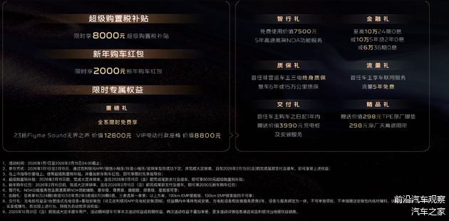 新春购车福利丰厚,现享8000元超级购置税补贴+2000元新年红包,叠加三电终身质保与免费充电桩,让品质出行无后顾之忧。星耀8用美学、舒适与智能,为新春出行注入仪式感,成为陪伴家庭奔赴团圆的理想座驾。