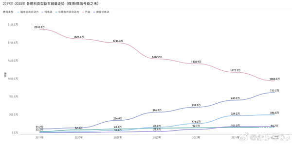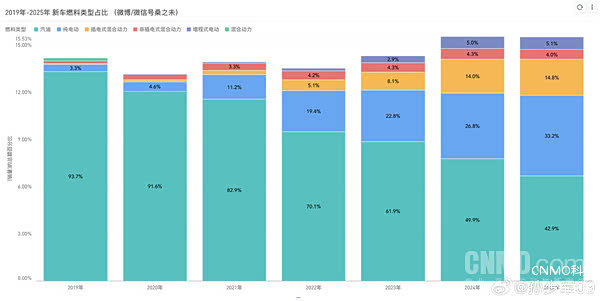【CNMO科技消息】2月10日,CNMO注意到,博主“孙少军09”发布了2019-2025年新车能源形式销量走势图。