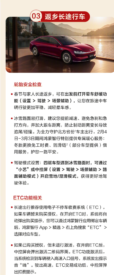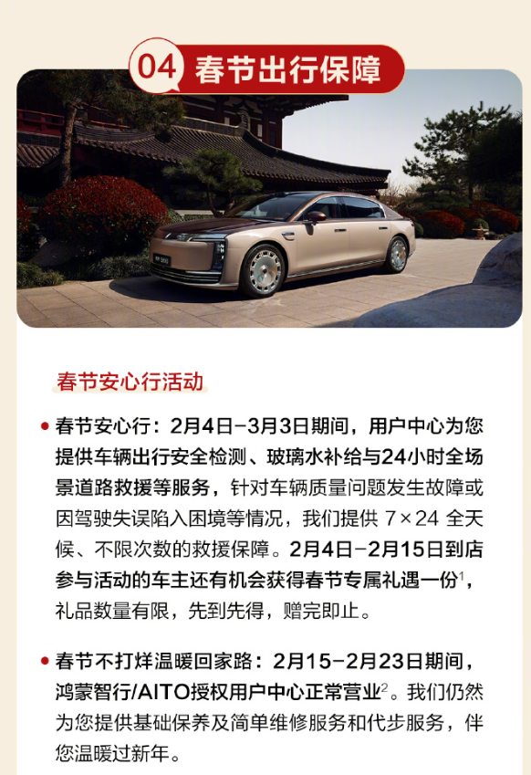 春节返乡让人头疼,事多行李多,开车还累,鸿蒙智行整理了一套出行贴士,很贴心,大家可以参考参考。如何检查车辆,怎么减缓驾车疲惫,他们都说的很清楚,还设置了春节安心活动:2月4日-3月3日,用户中心提供各种检查服务,24小时救援等;春节放假期间用户中心正常营业,提供保养+维修服务,借着休息把车拾掇拾掇;2月4日-15日,到店还能领新春礼品。马上过年了,先把年味烘托到位了,加上全系新春OTA升级,这趟回家过年能轻松不少。