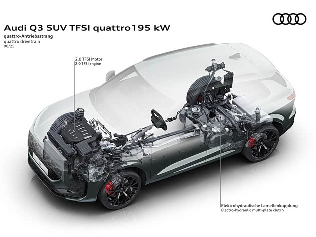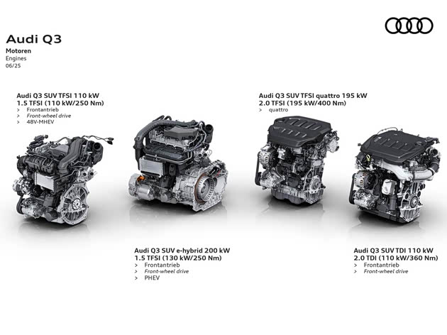 动力的话,海外全新奥迪Q3的汽油版车型提供3种动力,入门1.5T车型结合轻混和闭缸技术,更省油。中、高功率车型搭载2.0T发动机,功率比上代车型更出色,三种动力功率分别为110千瓦、150千瓦和195千瓦,中高动力均提供quattro四驱,与之匹配7速S tronic双离合变速箱。