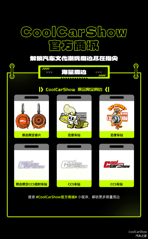 今年更有海量CoolCarShow官方展会限定和联名周边上线售卖,预售即将开启!锁定CoolCarShow官方商城小程序!