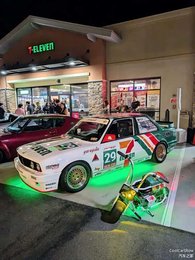 在Larry Chen的车库里,我们看到有日产GT-R R32/240Z、丰田的Chaser/ Supra、保时捷996 911,还有宝马的E30。合照左上角的这辆宝马E30搭配了Larry Chen喜爱的7-ELEVEN涂装和复古造型的Rotiform轮毂,整体造型简约而不失韵味。这辆车还是他闲暇时候去赛道日撒欢的大玩具,所以能看到不简单的倾角设定,内饰也应对赛道做了升级强化。
