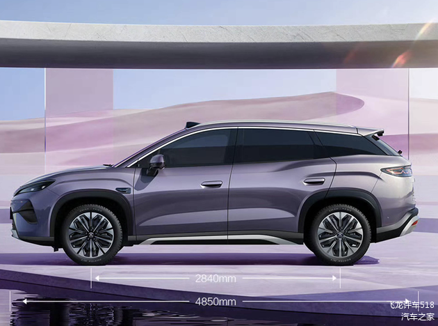 来到车身侧面,比亚迪宋Ultra EV依旧延续了比亚迪宋系列的轿跑式SUV车身轮廓,弧线形的车顶配备了激光雷达,倾斜的A柱与弧线形车顶一气呵成,车窗上沿加入了银色的镀铬装饰条点缀,全车黑色隐私玻璃与黑色的B柱、C柱、D柱巧妙地融为一体,让悬浮式车顶的效果更加立体。再配上外扩的前后肌肉腰线,内凹的车门型面以及银黑双色的迎宾踏板,也让整车的层次感更加鲜明。四个隐藏式门把手的加入,也让车身更加简洁。配备了19英寸的轮圈,匹配了235/50 R19规格的轮胎,兼顾舒适性和稳定性。宋Ultra EV融合了宋L EV和宋L DM-i的设计精髓,宋Ultra EV的整车尺寸比比宋L DM-i更大,新车长宽高分别为4850/1910/1670mm,轴距为2840mm。