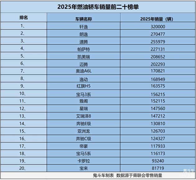 咱们直接上数据,日期,鬼哥根据乘联会零售销量数据,整理出2025年燃油轿车销量排名前二十榜单,从榜单上看到,在2025年,共有18款燃油轿车累计零售销量超过十万辆。接下来,看看具体排名与销量表现?