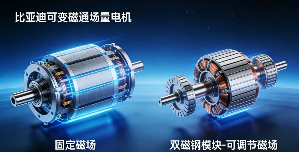 传统永磁同步电机的磁场是固定的,低扭充足但高速要靠“弱磁控制”硬扛,所以额外耗电,效率不行;异步电机是高速效率还行,但低速扭矩弱,还得靠大电池补续航,可变磁通量电机是自己可以动态调节磁场,低速大扭矩,高速低能耗,全速域都高效;但本质还是径向磁通电机,只是在转子上增加了调磁组件,通过改变磁路来调节通量,不是轴向磁通那种 “薄饼式” 结构。