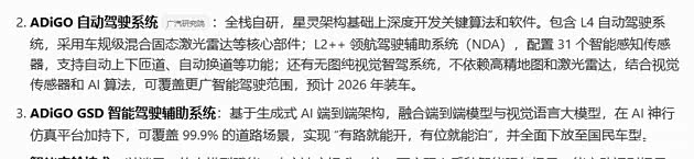 第二个:自动驾驶技术,的确,现在市面上华为的智驾做得很不错,比亚迪有天神之眼,可广汽也有两套自己的智驾系统,ADiGO自动驾驶系统和ADiGO GSD智能驾驶辅助系统,现在的广汽已经实现了无图纯视觉智驾系统,可以实现不依赖高精地图和激光雷达,实现智能驾驶,可惜的是广汽集团不怎么宣传自己的智驾。