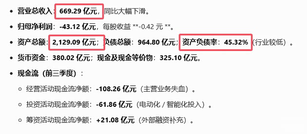 第六个:不错的现金流和资金压力,从盈利情况来看,确实是有点惨的,不管是归母净利润还是扣非净利润,广汽集团的2025年情况都不乐观,可当我们仔细去看营业总收入,人家还是有669.29亿,并且在归母净利润减少43.12亿的情况下,人家的资产总额还有2129.09亿,负债情况才964.8亿,负债率也处于行业较低的45.32%,广汽的底子还算是很好的。