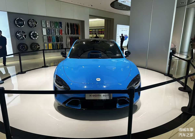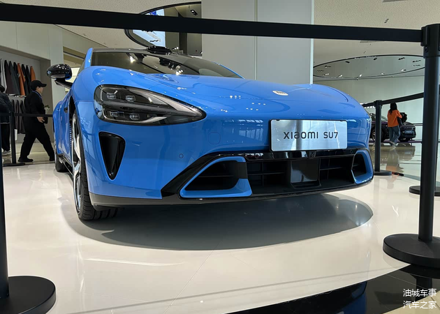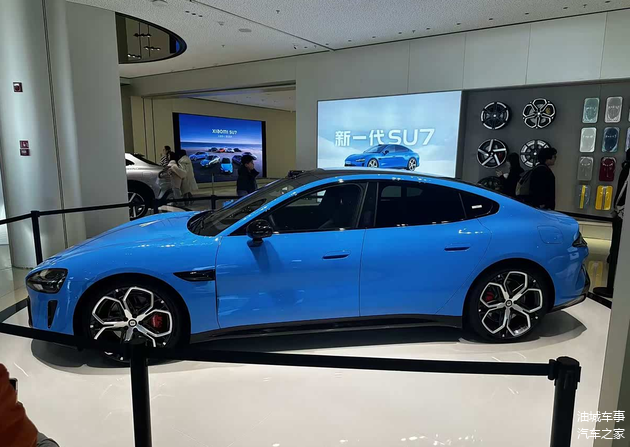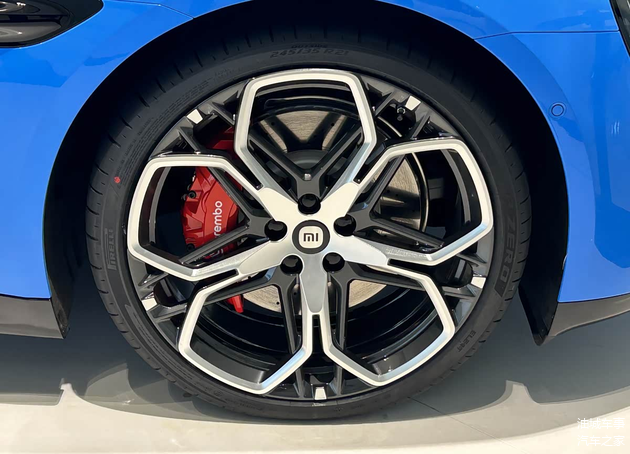 展车所展示的是新增的卡布里蓝车漆配色,新款 小米SU7在外观层面的调整主要集中在前包围部位,进气口造型经过重新优化,并新增了雷达感应装置,两侧导流槽装饰的视觉效果更具整体感。外后视镜改为与车身不同色的黑色设计,新车还换装了全新样式的轮圈,采用黑色烤漆与金属花瓣相结合的造型,尺寸为21英寸,内部配备Brembo制动卡钳。除此之外,外观其余部分与现款车型基本保持一致。
