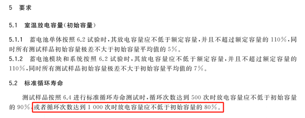 GB/T 31484-2015《电动汽车用动力蓄电池循环寿命要求及试验方法》中,明确表示1000次循环之后,电池容量不得低于80%,低于80%则可以判定电池包到了寿命终点。