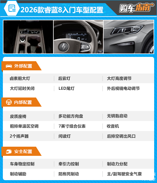 2026款睿蓝8的入门车型配置水平有限,所提供的功能较为基础,仅能满足简单代步需求,甚至连多媒体触控屏都没有配备,所以此次并不推荐。