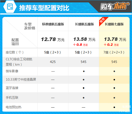 通过配置对比可以看出,推荐车型相比入门的标准续航五座版,不仅续航里程显著提升,还拥有七座布局,空间更加灵活,能够适应多样化的出行场景。同时,配置上还增加了10.33英寸中控液晶屏、倒车影像与蓝牙连接等,日常用车便利性大大提升。