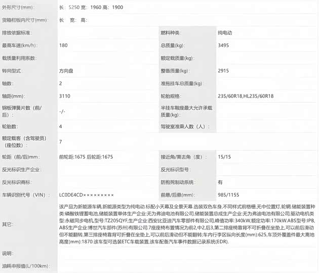 外观方面,新款腾势D9 EV的核心调整集中在前脸部位。现款车型的直瀑式前脸结构被替换为鳞片式风格,同时提供纵置排布饰条的选装版本,与现款腾势D9 DM细节形成区分。(下图为新款腾势D9 EV四驱车型申报图)