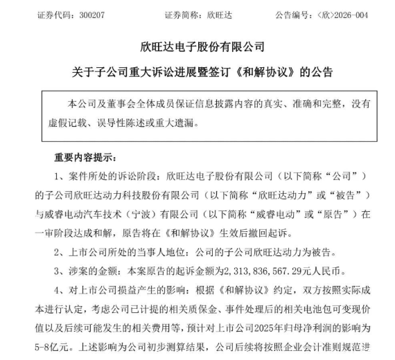 就在外界以为该诉讼难以收场之时,2月6日峰回路转,欣旺达发布公告,称已与吉利和解,将赔偿吉利6.08亿元,该金额为扣除已承担费用后的剩余赔偿款。
