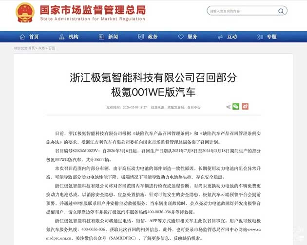 极氪召回3.83万辆车,具体车型是 极氪001 WE版,原因是动力电池长期使用后,可能会出现性能下降等情况。