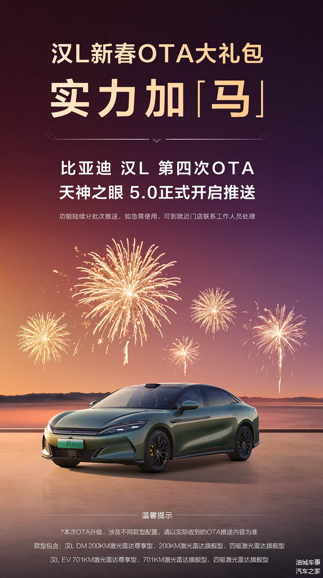 2月11日,比亚迪官方宣布,旗下中大型轿车 汉L正式启动新一轮OTA升级。此次升级涉及29项新增功能与6项功能优化,其中天神之眼5.0版本也随本次推送正式落地。