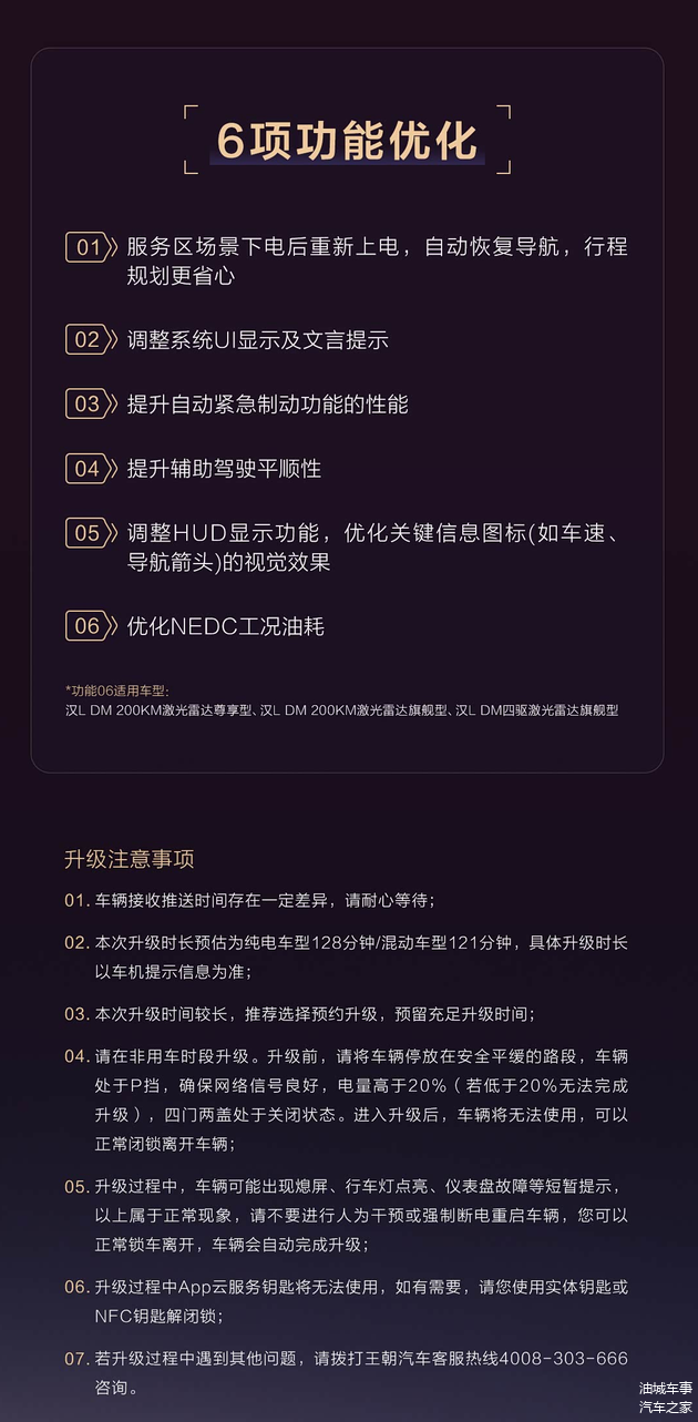 功能优化方面,主要涵盖服务区场景下电后重新上电自动恢复导航、系统UI显示及文言提示调整、自动紧急制动性能提升、辅助驾驶平顺性优化,以及NEDC工况油耗优化。
