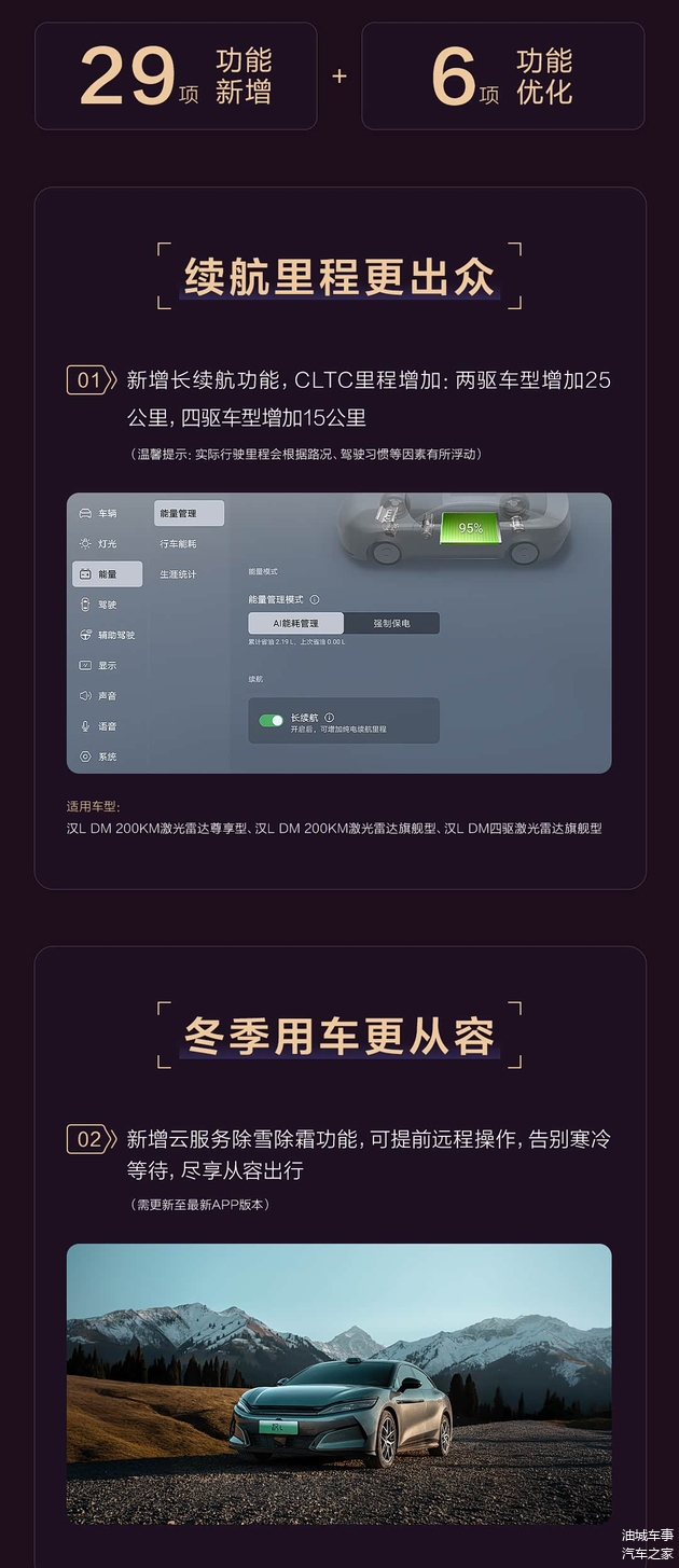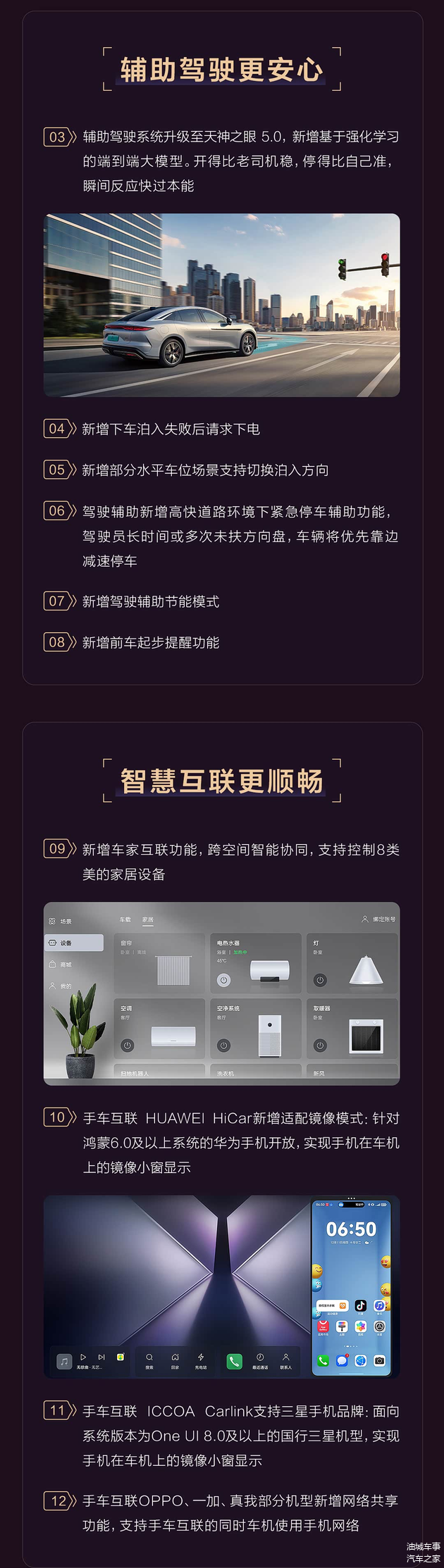 具体新增功能包括:长续航模式、云服务除雪除霜、下车泊入失败后请求下电、部分水平车位场景支持切换泊入方向、高快道路环境下紧急停车辅助、驾驶辅助节能模式、前车起步提醒、车家互联、HUAWEI HiCar适配镜像模式、多款萌宠主题、车生活Agent智能点单、智慧物联软件商城车机密码支付及刷脸支付、用户自定义锁车音效、车载电子木鱼小游戏、HUD账号记忆、Pad空调界面出风颜色显示等。