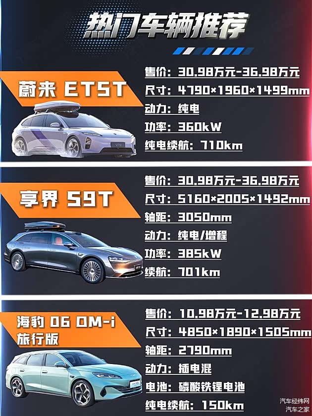 蔚来 ET5T 以纯电高端体验、满配智驾与极致舒适,成为追求科技感与长途品质的用户首选。享界 S9T 凭借鸿蒙生态、超长续航与华为智驾,完美适配注重互联体验与无焦虑出行的家庭。海豹 06 DM-i 旅行版则以超高性价比、混动经济性与灵活空间,打动务实派家庭与年轻用户。