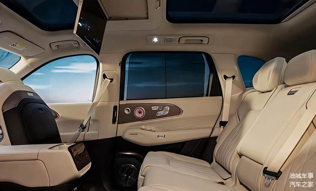 内饰部分,极氪8X延续了极氪9X的整体布局思路,但在功能配置上做了差异化处理。中控台采用T字形设计,造型较为宽厚,上方布置有由中控屏与副驾娱乐屏组成的一体式连屏。换挡机构采用怀挡式设计,这种布局为中央通道区域腾出了更多储物空间,手机无线充电功能也得以安置于此。后排娱乐系统的处理与极氪9X有所不同,8X并未采用可前后移动的屏幕方案,而是将显示屏固定在前排双天窗之间的位置。音响系统方面,极氪8X将搭载Naim品牌音响,这一配置在同价位车型中并不多见。