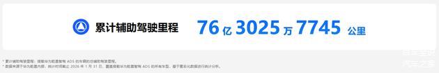 我知道你在期待什么,是不是华为乾崑智驾ADS?可以肯定的是,它也将搭载在奕境首款家庭旗舰大六座SUV上,辅助驾驶最重要的价值,从来不是对外展示能力和炫技,而是真正帮助用户降低驾驶压力,而华为乾崑智驾ADS真正做到了这一点。截至2026年1 月31日,这套系统的累计辅助驾驶里程,已经达到了76亿3025万公里(数据来自华为乾崑智驾ADS安全出行报告),这个庞大数字的背后是卓越的安全与用户的信赖。并且,驾驶搭载华为乾崑智驾ADS的车辆,无论是人驾还是辅助驾驶,平均安全行驶里程都获得了显著提升(结论来自华为乾崑智驾ADS安全出行报告)。