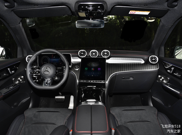 进入车内,梅赛德斯奔驰AMG GLC53采用了大面积灰色Alcantara面料的包裹,并配有大量红色真皮皮革的点缀,还融入了碳纤维装饰板和很多圆形元素的加持,前排配备了两个桶状赛车座椅,提供了更好的包裹和支撑性,还可以选择四点式安全带。中控台延续了GLC的经典设计,12.3英寸的LCD全液晶仪表和12.8英寸的中控液晶大屏。中控台配备了AMG家族式运动方向盘,中控台上使用了大量的碳纤维面板,整体造型依旧突出了AMG的设计风格。操控岛更加简约,还配备了炮筒式空调出风口,强化了整车的运动氛围。