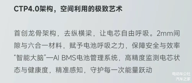 电池包也采用了龙骨架构专利的CTP4.0,通过大幅削减电池模组,让整车进一步实现轻量化。