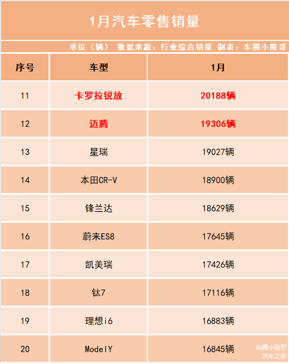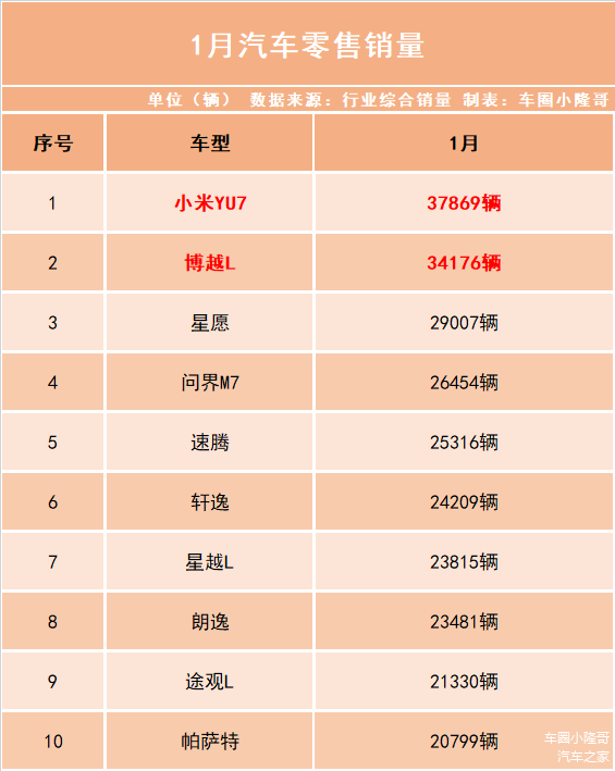 1月份乘用车零售销量公布, 小米YU7以37869辆的成绩夺得第一,需要注意的是,这是没有加定语的销量榜。比亚迪多款车型销量跌出前20!特斯拉Model Y月销量跌出前十。