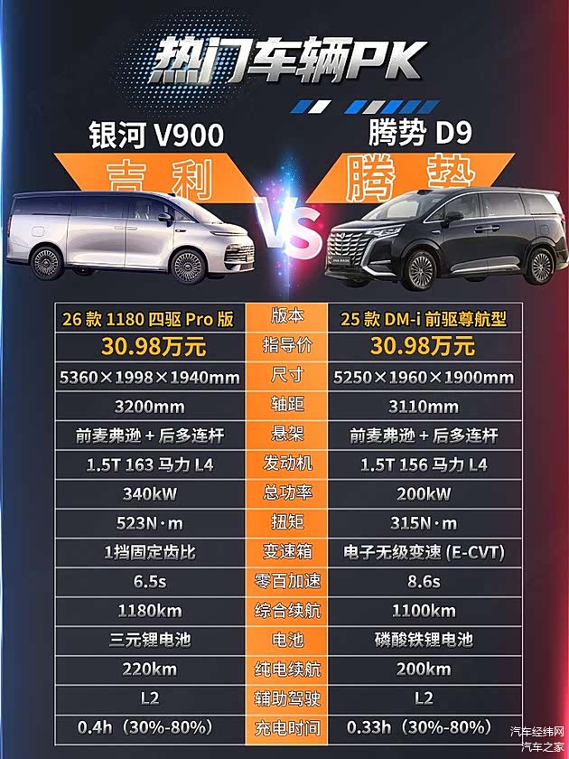 吉利银河V900 2026款1180四驱Pro版售价为30.98万元,而腾势D9 2025款DM-i两驱尊航型售价为30.98万元,两款车售价一致,那么哪一款车更值得入手呢?