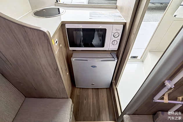 接着看厨房,配备了电磁炉、洗菜盆、50L车载冰箱和微波炉等,台面下方有储物柜,可以盛放锅、碗、瓢、盆、筷子、勺子、调料、糖、盐等厨房用品。做饭时可以把尾窗打开,毕竟没有配备油烟机。