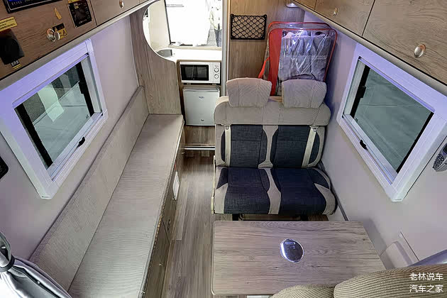接下来就是生活区了,进门后往车尾方向看,可以看到一侧是长条沙发,沙发底部有很多储物格,可以满足家庭收纳需求。一侧是两张座椅+一张升降桌。再往后走,就是厨房和洗漱间了。
