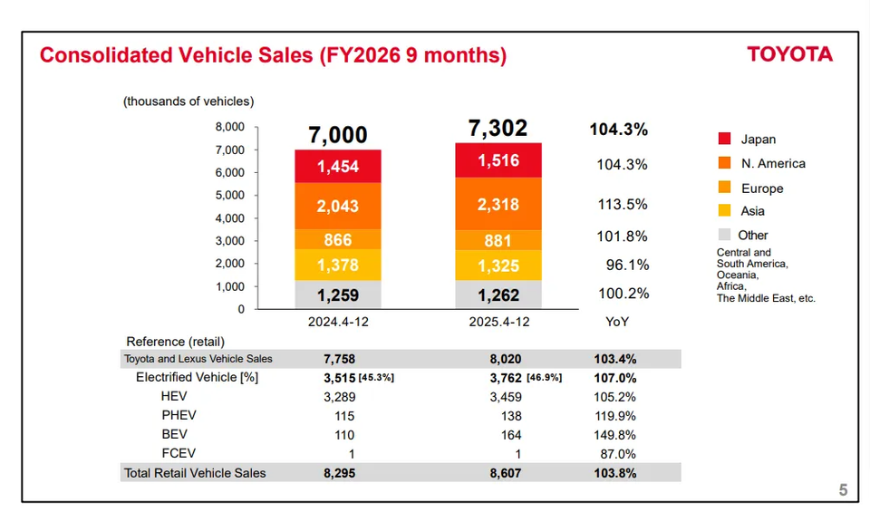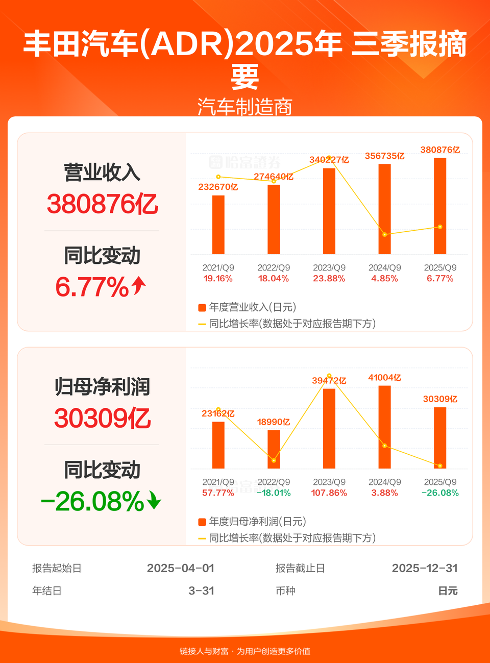 丰田的财报出炉了!全年卖了966.2万辆车,蝉联全球销冠,平均一辆车赚1.7万人民币,全年净利润约1649亿……能看出来丰田虽然依旧是全球卖车最多的车企,盈利能力依旧很强,但整体日子并不是特别好过,从去年Q2季度开始营收上涨但营业利润和净利润双双下滑,北美因关税由盈转亏,亚洲市场销量也在下滑,不过中国市场营业利润实现增长,丰田通过降本增效改善经营,还上调了本财年利润预期,金融服务业务成为新的利润增长点,电动化车型占比近半,但以混动为主,纯电车型占比只有 4.4%,能看出来丰田的转型还是很保守,丰田现在稳字当头、靠传统优势和精细化管理在扛市场压力。不过现在丰田给国内放权了,如果铂智7能一炮而红的话,未来丰田在国内的电车可能会迎来爆发期,所以还是挺期待的。