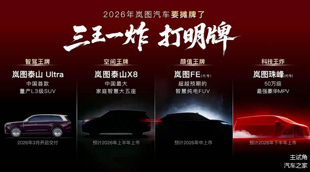岚图泰山X8是一张“空间王牌”,将于2026年上半年上市。该车将搭载问界M9同款四激光雷达,首发华为全新一代交互座舱,同时还拥有独一无二的超大空间。项目代号“岚图FE”则是一张“颜值王牌”,它是岚图联合华为乾崑重磅推出的“超越预期的智慧纯电FUV”,具备高颜值的设计美学、行业领先的四激光雷达感知系统,L3级智能辅助驾驶硬件,领先一代的AI交互智能座舱等优势,新车预计在2026年中上市。