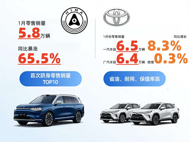 除头部三强外,1月车市还有两大亮点值得关注,对新能源车型潜在消费者具有重要参考价值。其一为鸿蒙智行,当月零售量达5.8万辆,同比暴涨65.5%,首次跻身零售销量TOP10,成为1月车市核心增长亮点。其旗下问界M9、M8等车型,依托华为智能座舱与鸿蒙生态的技术优势,精准切入高端新能源市场,打破传统车企在该领域的垄断格局,印证了“智能+生态”的行业发展趋势。其二为南北丰田,在多数车企销量下滑的背景下,一汽丰田同比增长8.3%、广汽丰田微增0.3%,成为TOP10中为数不多实现销量增长的车企。卡罗拉、RAV4荣放、凯美瑞等主力车型,凭借省油、耐用、保值率高的核心优势,持续获得家庭用户认可,市场口碑效应持续释放。