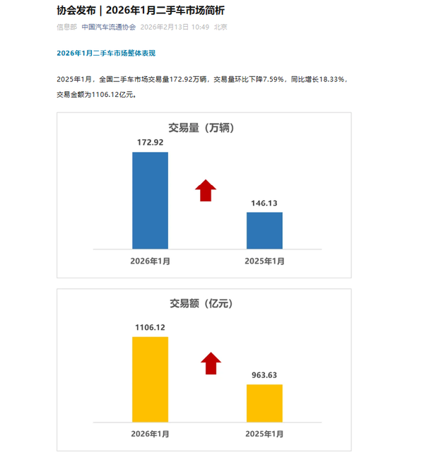 【CNMO科技消息】2月13日,中国汽车流通协会最新发布的数据显示,2025年1月全国二手车市场交出亮眼成绩单,交易量达172.92万辆,同比增长18.33%,交易金额达1106.12亿元,尽管交易量环比下降7.59%,但同比大幅增长态势凸显市场强劲复苏势头与发展韧性,为全年二手车市场发展奠定良好基础。