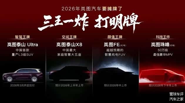 在此基础上,岚图汽车继续保持产品高效迭代节奏,为2026年发展亮出明牌,发布“三王一炸”的新品计划,新车全部搭载L3级智能辅助驾驶硬件。“三王”代表三款“王牌级新车”,包括按照L3级自动驾驶架构设计的岚图泰山Ultra 、“庭院级大五座SUV”岚图泰山X8、以及项目代号为“岚图FE”的全新FUV。其中,岚图泰山Ultra是一张“智驾王牌”,是央国企首款按L3级架构设计商用量产第一车,将于 3 月上市。此外,岚图泰山黑武士将于3月登场。