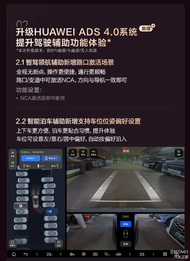 在智能驾驶辅助方面,此次OTA升级进行了深度优化,六座版、七座版、无人机版先升级HUAWEI ADS 4.0,之后全系车型升级为HUAWEI ADS 4.1,带来十余项智驾功能升级,覆盖领航、泊车、主动安全等应用全场。