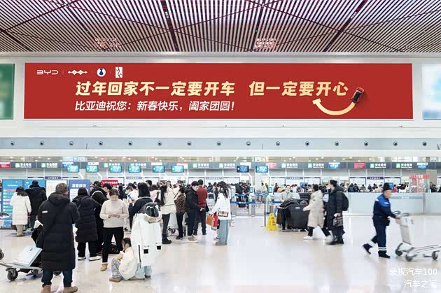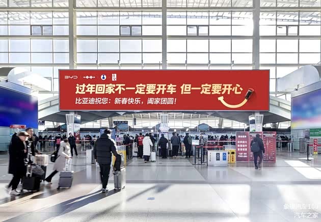 2026年的新春将至,当南来北往的人流,在机场、高铁站、火车站、高速公路上汇成归乡的浪潮,比亚迪在各大机场的巨幅广告牌上,写下了一句让匆匆步履稍作停顿的话:过年回家不一定要开车,但一定要开心。