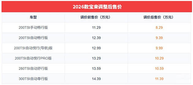 具体来看,近日一汽-大众官方公布,2026款 大众宝来开启调价(即官降),新车价格从原先的11.29-14.39万元(2025款车型售价)调整至8.29-11.39万元,调价幅度为3万元。
