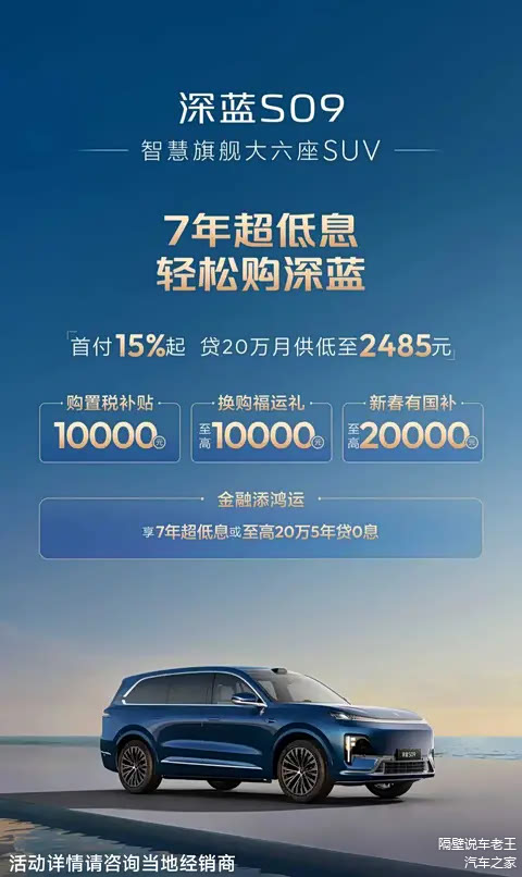 目前,深蓝S09正推出7年超低息搭配首付15%起购车优惠政策,月供压力“马”上清零!此外还可享至高10000元的购置税补贴及至高10000元的换购福利等综合优惠。马年接好运,把福气“开”回家!如果你也在寻找一辆能装下全家幸福、带给所有人体面与舒适的大六座智慧SUV,那么深蓝S09,值得你像老王一样,亲自去感受,然后做出那个不会后悔的选择。