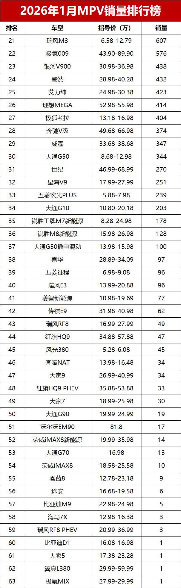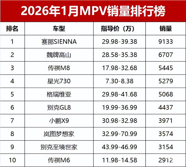 【2026年1月MPV零售销量排行榜 完整版】乘联会数据显示,2026年1月国内MPV市场零售销量达7.9万辆,同比小幅增长1.0%。在传统轿车和SUV市场纷纷下滑的背景下,春节长假带来的家庭出行需求,让MPV成为车市“清流”。高端MPV站稳脚跟,自主与合资各占半壁江山;经济型MPV凭借高性价比守住基本盘;新能源MPV表现分化,63款上榜车型呈现“头部集中、尾部低迷”的格局。燃油车再霸榜!1月MPV销量榜揭晓,赛那又夺冠, 腾势D9跌出前十!