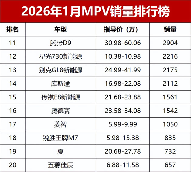 榜单第十至二十位,销量集中在1500-2900辆。传祺M6以2912辆排名第十,腾势D9紧随其后,2904辆的销量仅落后8辆,竞争激烈。星光730新能源、别克GL8新能源、库斯途均破2000辆,分别以2216辆、2175辆、2112辆排名12至14位,新能源MPV渗透率逐步提升但增速不及行业平均。