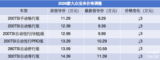 日前,我们从一汽-大众官方获悉,2026款 大众宝来现已完成价格调整,最新官方指导价为8.29万-11.39万元,全系降幅3万元。值得一提的是,此次2026款大众宝来的调整不涉及产品层面。