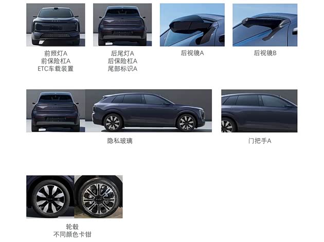 车身侧面采用溜背式轮廓,车顶前缘配有激光雷达,前翼子板设有感知摄像头。前后侧翼子板采用宽体轮眉设计。轮圈提供21英寸与22英寸多种样式,其中22英寸八条辐轮圈为首发款之一。外后视镜提供电子版与传统光学版两种可选。