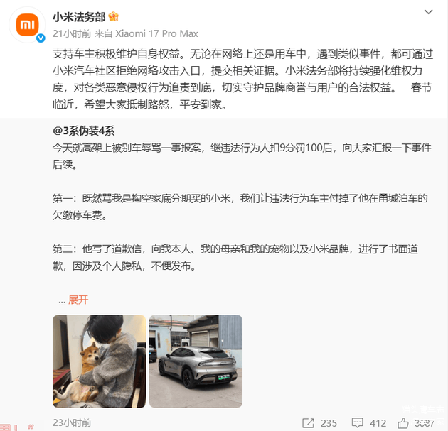 据猫头鹰车志了解,针对此次高架别车辱骂事件,小米法务部2月11日转发相关内容时明确发声,支持车主积极维护自身合法权益,并称无论在网络上还是用车过程中,车主遇到类似事件,均可通过小米汽车社区拒绝网络攻击入口提交相关证据,小米法务部将持续强化维权力度,对各类恶意侵权行为追责到底,切实守护品牌商誉与用户合法权益。